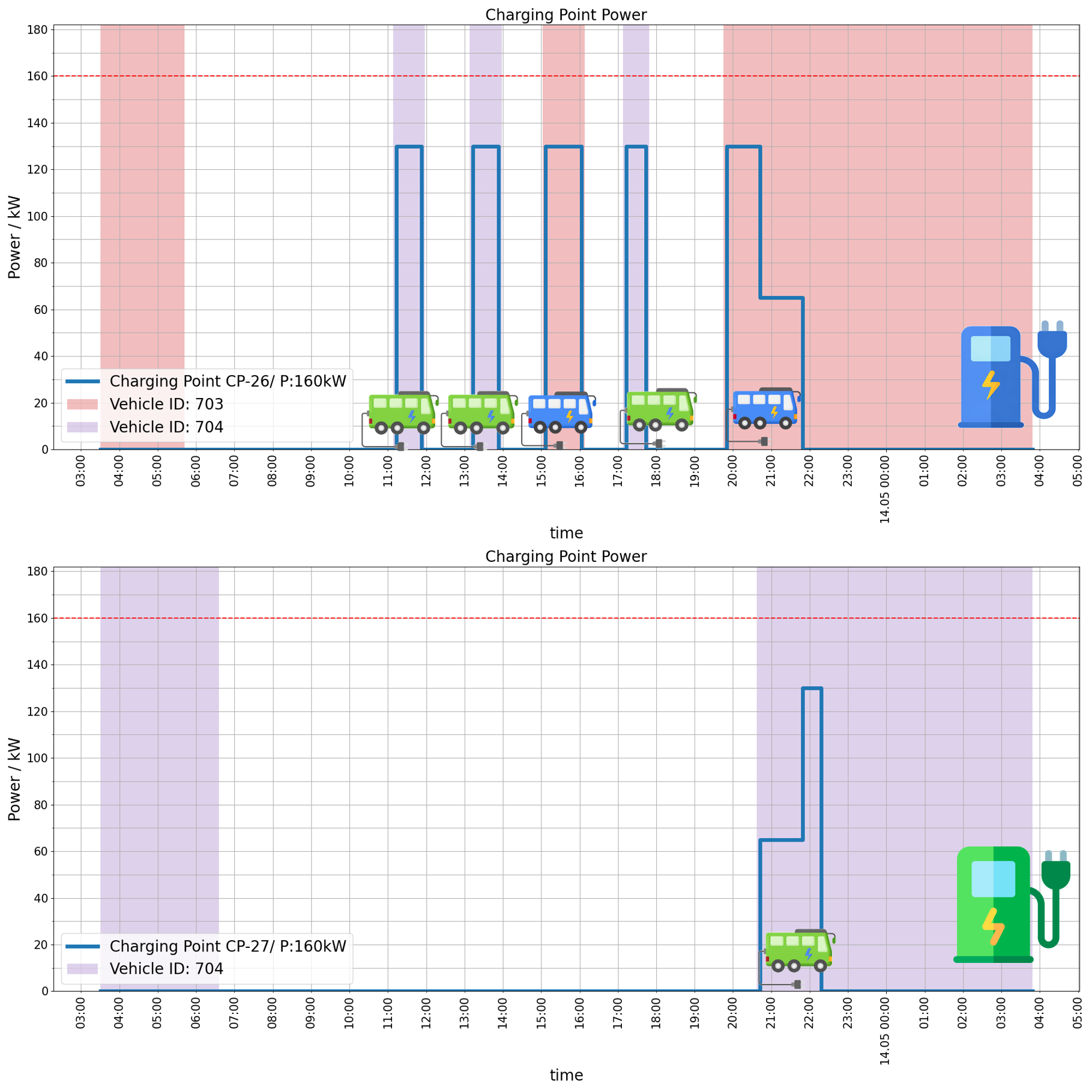 Da jedes Fahrzeug einen Ladepunkt (blau oder grün) zugewiesen werden muss, wird in der folgenden Abbildung die Ladeleistung je Ladepunkt betrachtet. Dabei fällt auf, dass der grüne Ladepunkt kaum benötigt wird.