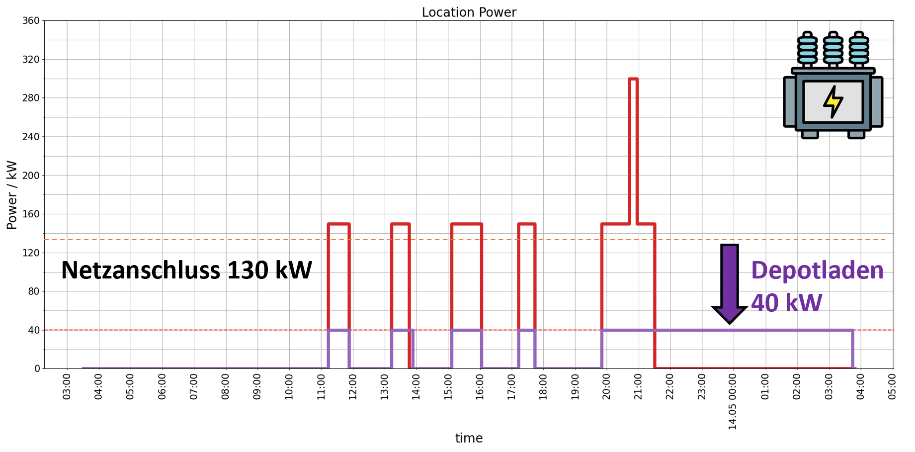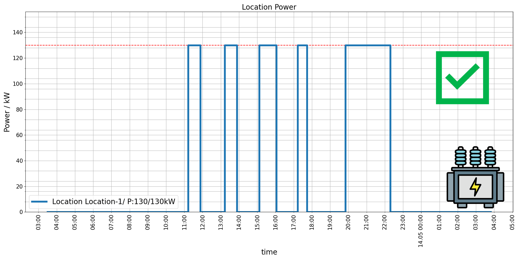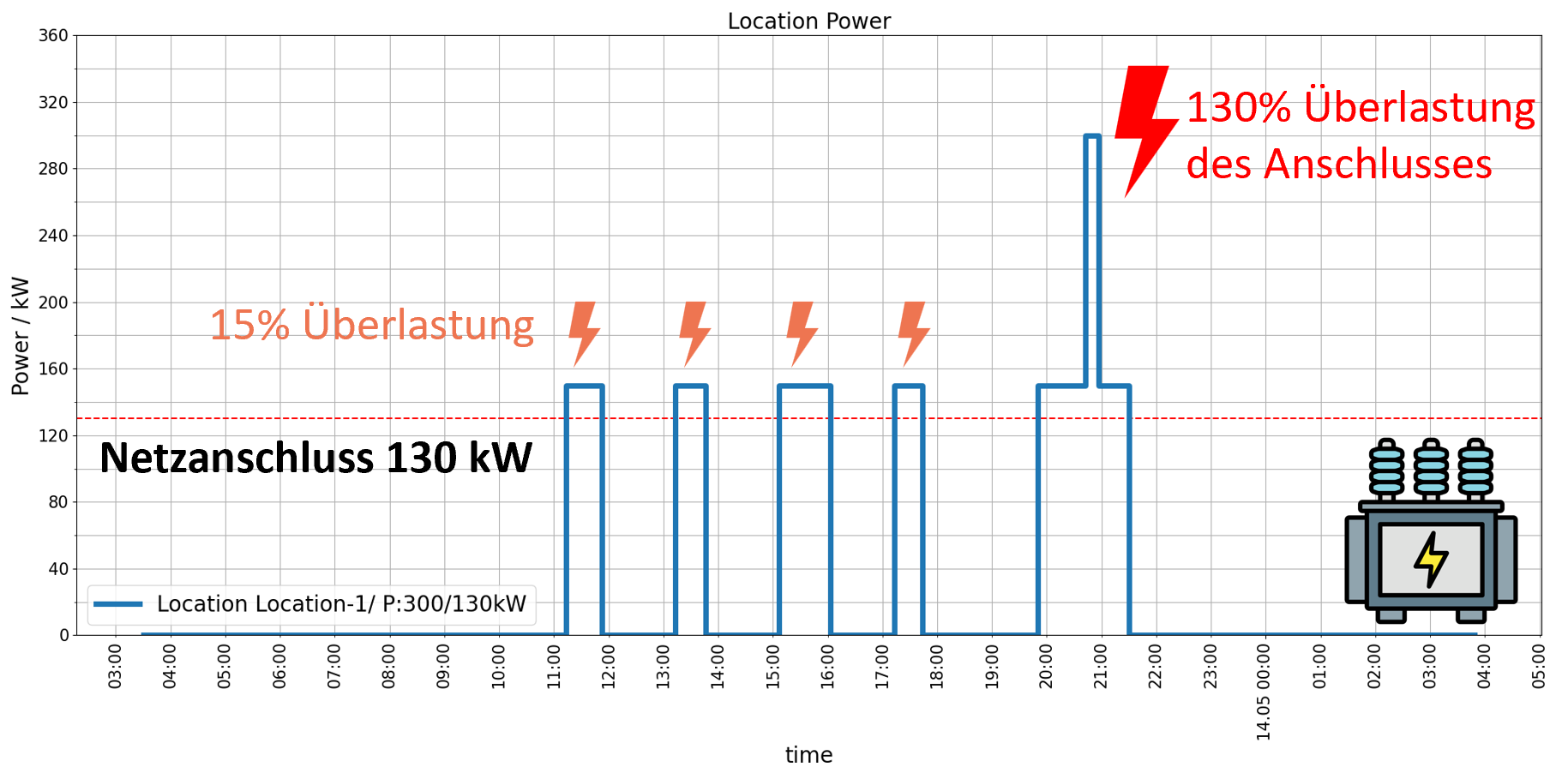 Ein Blick auf den aggregierten Lastgang am Ladeort zeigt jedoch, dass durch das ignorieren der Ladeinfrastruktur-Limits die zulässige Last (max. 130 kW) am Ladeort überschritten würde.