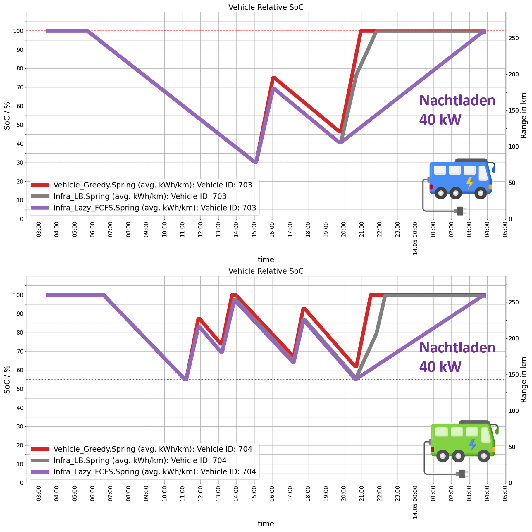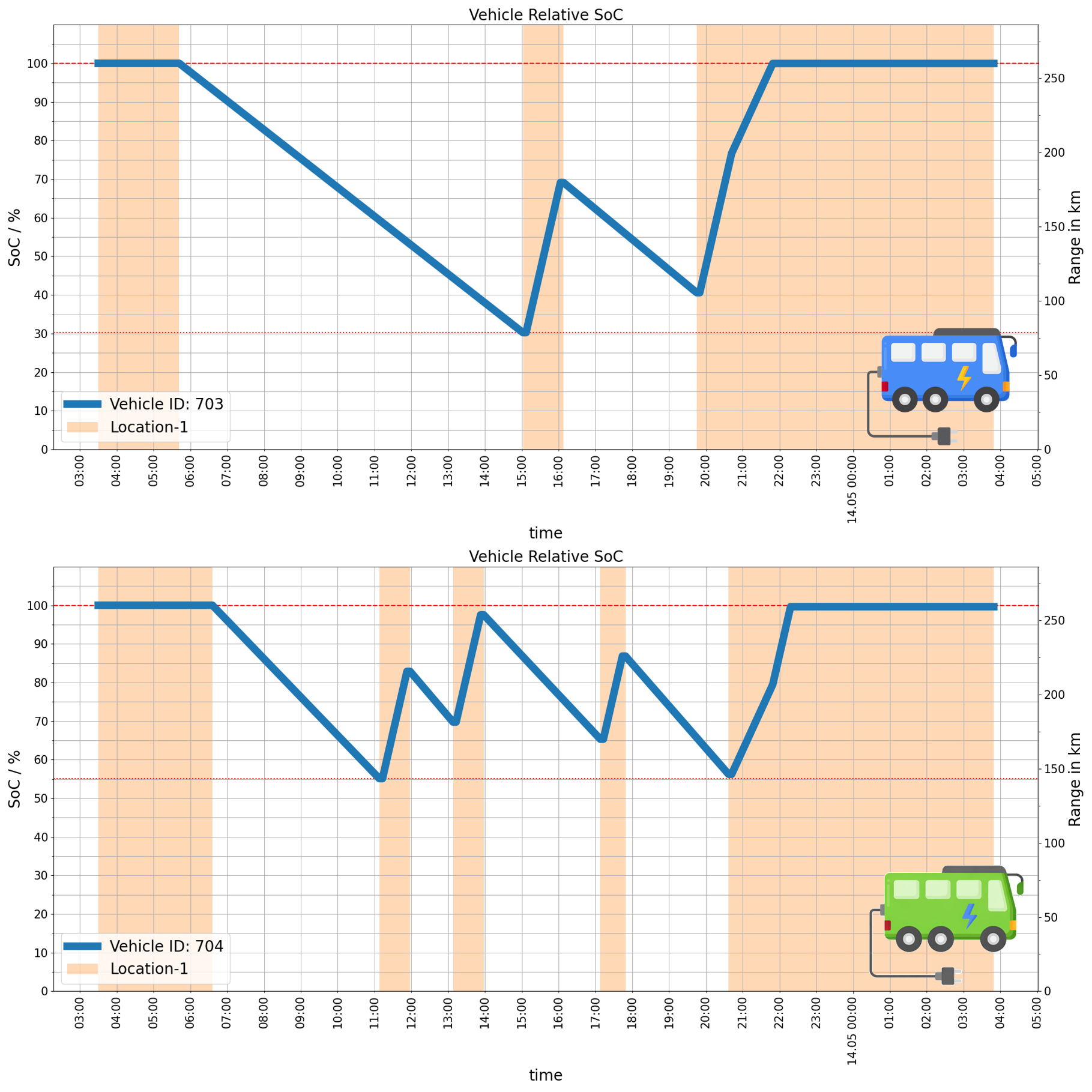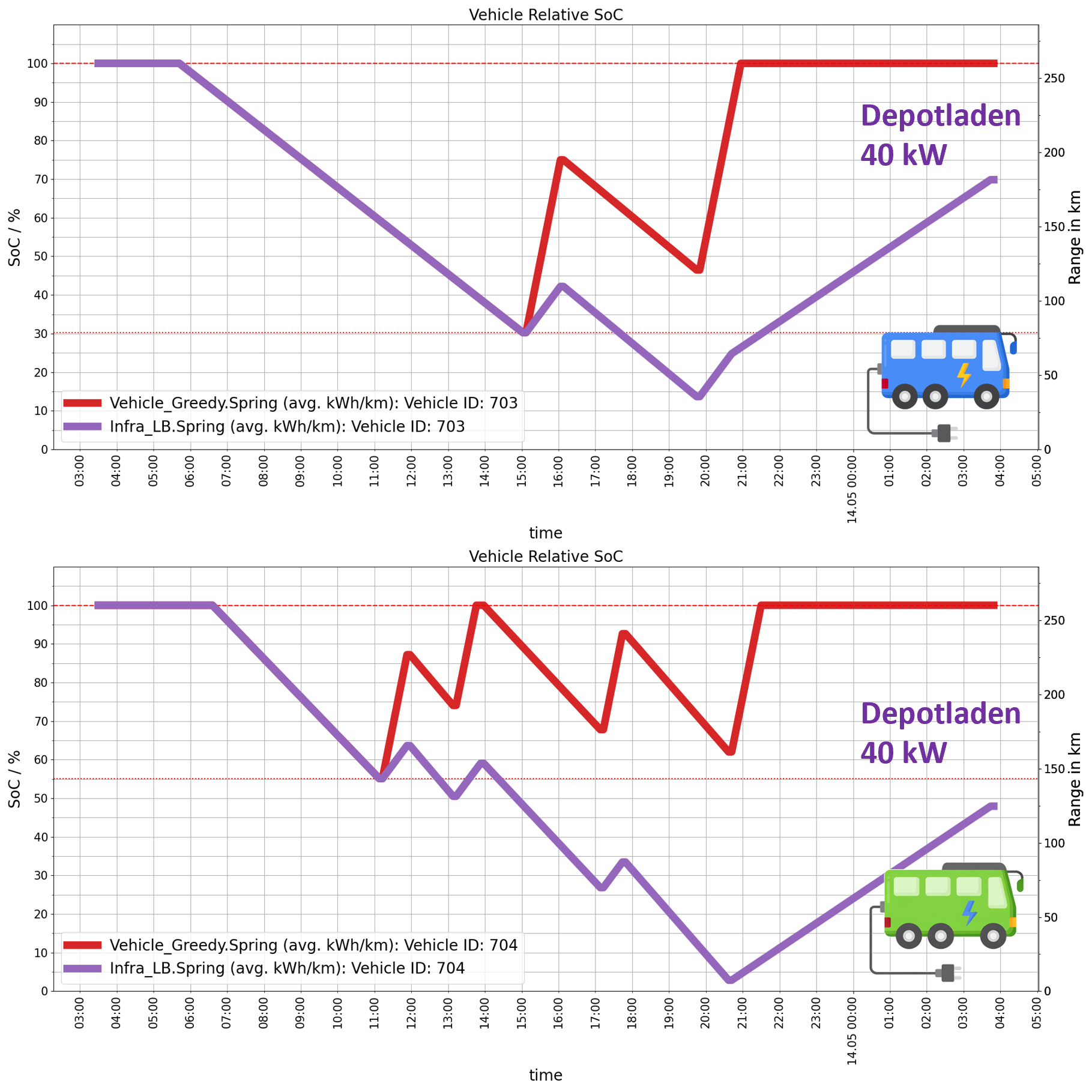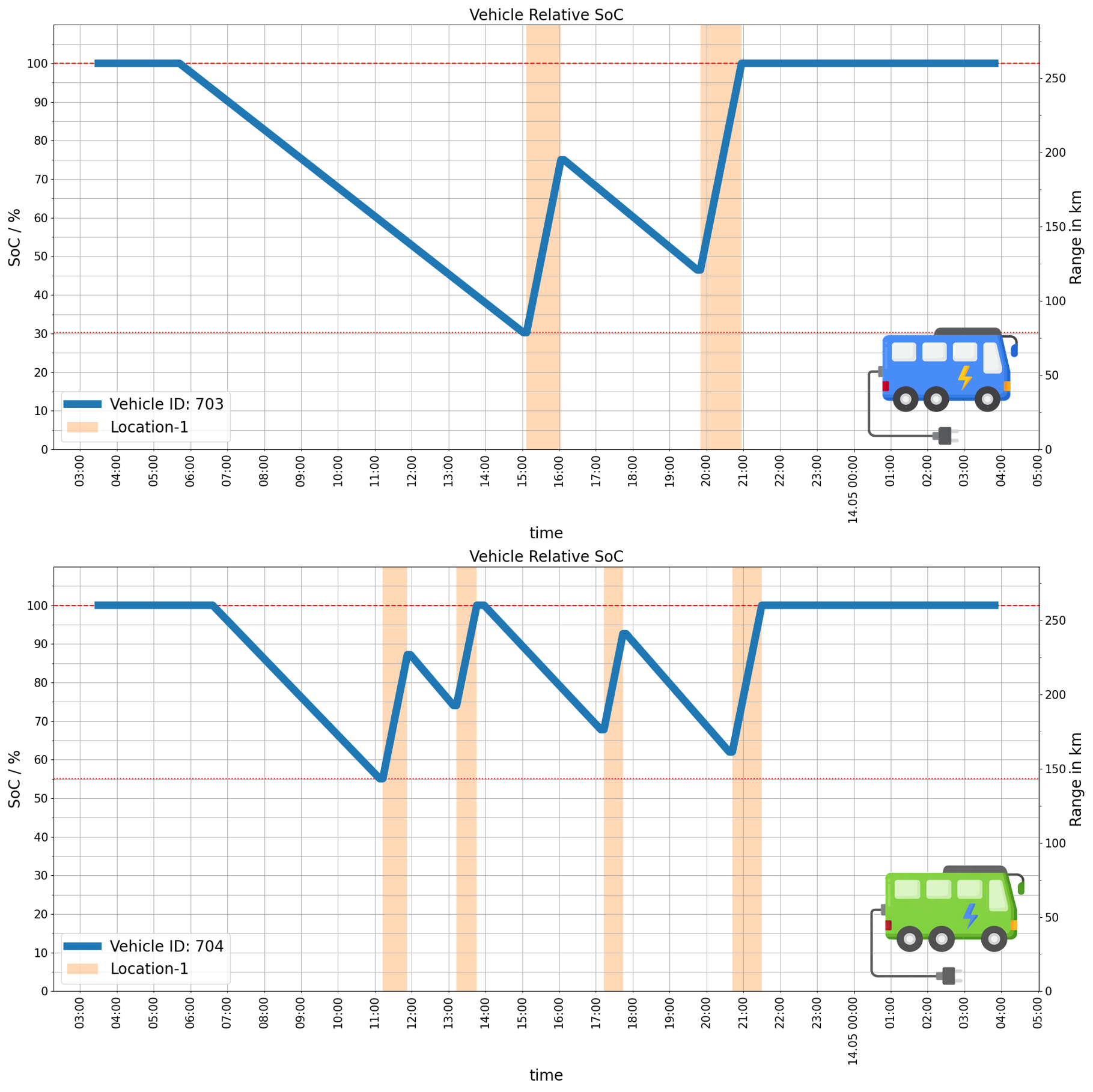 In der folgenden Abbildung ist an Hand des Batterieladestands (State of Charge, SoC) zu sehen, dass beide Fahrzeuge ihre Fahrten problemlos meistern und rechtzeitig geladen werden können.