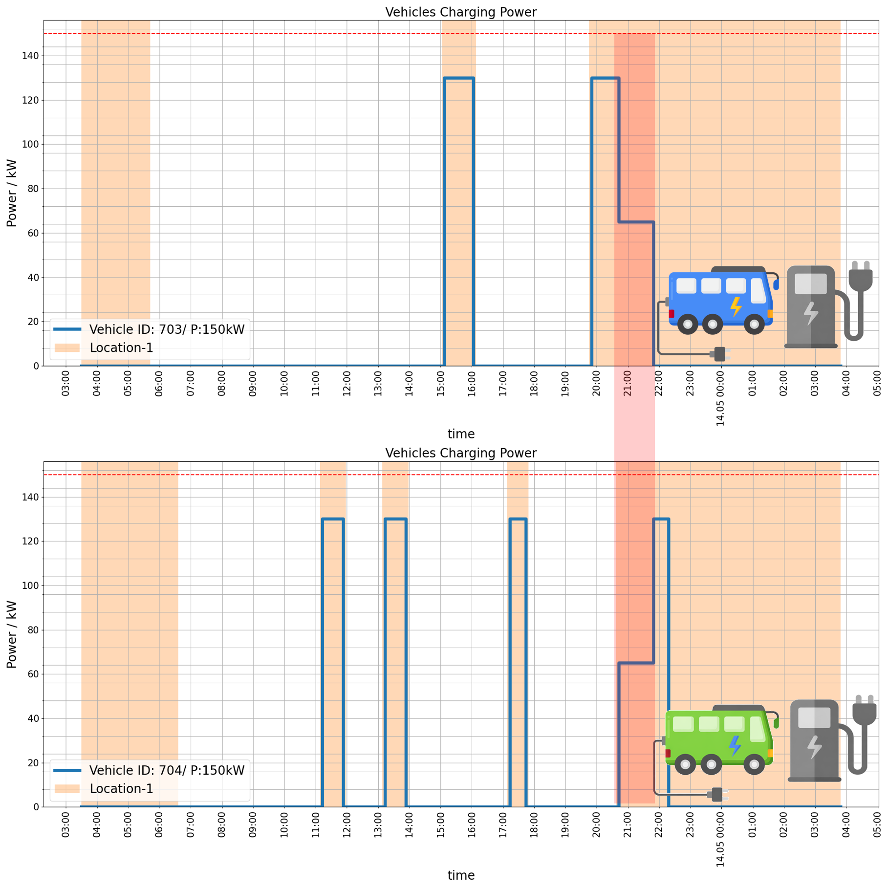 Die max. Ladeleistung je Fahrzeug beträgt 150 kW, welche in den Ladeintervallen auch vollständig bezogen werden.