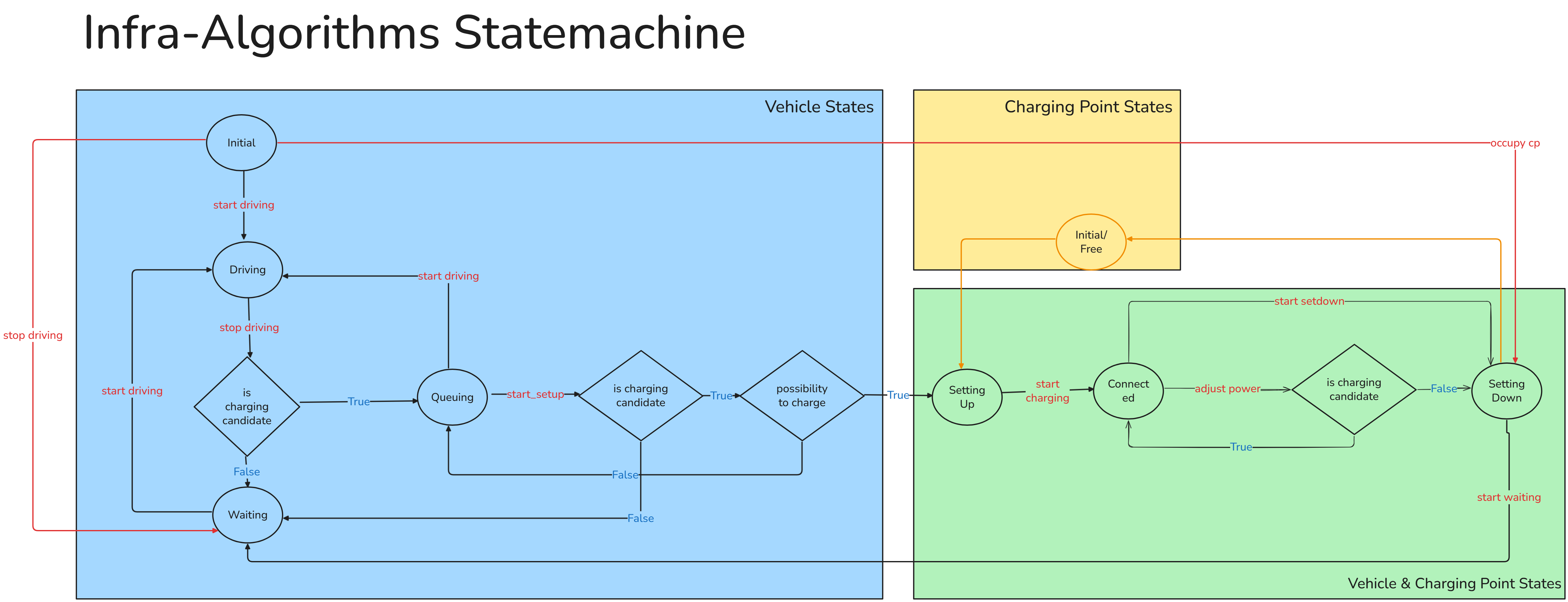 Die Infra-Algorithmen können im Allgemeinen als Zustandsmaschine für Fahrzeuge und Ladepunkt dargestellt werden, d.h. jedes Fahrzeug und jeder Ladepunkt haben zu jedem Zeitpunkt ein bestimmtes Zustand und können nur durch bestimmte Aktionen in ein anderes Zustand versetzt werden. Darüberhinaus ist der Zustand des Fahrzeugs während eines Ladevorgangs (inkl. setup und setdown) mit dem Zustand der verbundenen Ladestation synchron.