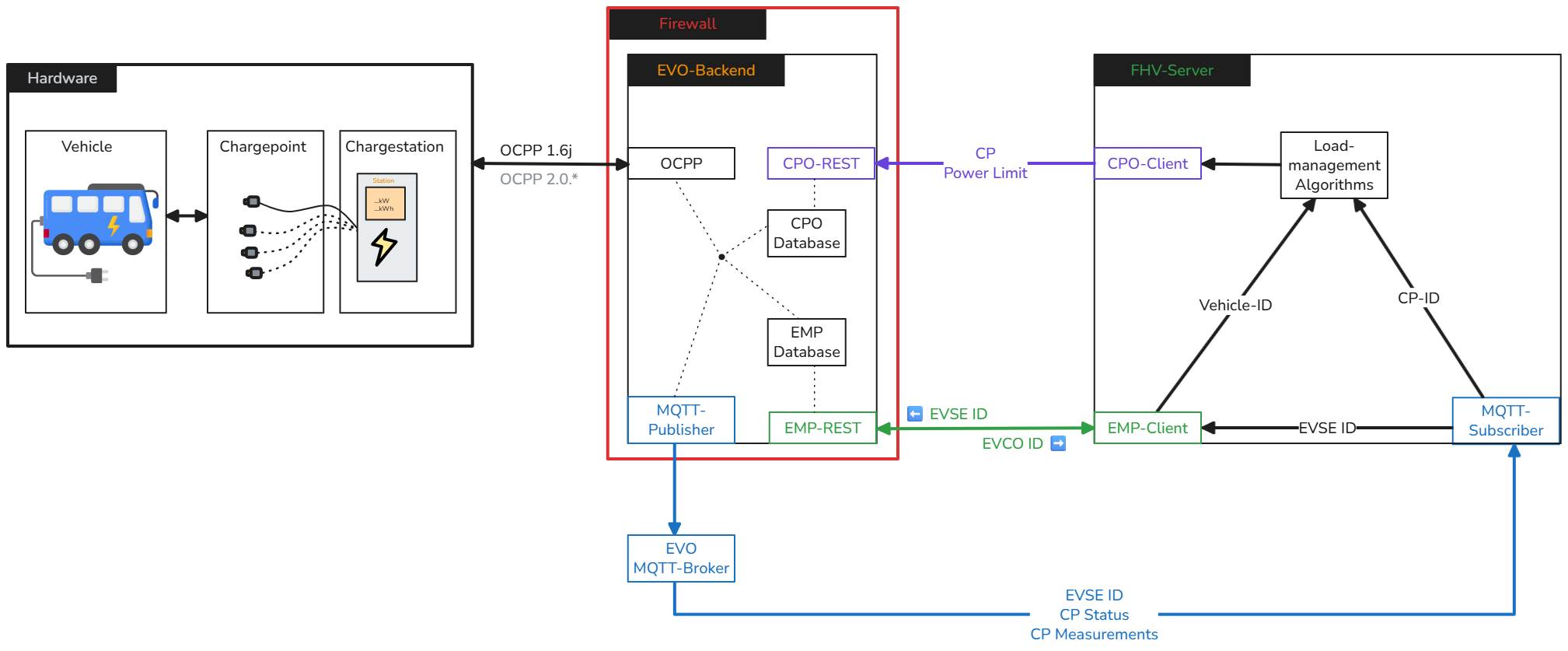Es wurde eine modulare IT‑Architektur aufgebaut, die Ladeprofile von der FHV‑Serverumgebung an das EVO‑CPMS überträgt und Monitoring‑Daten zurückliefert — ohne produktive Einbindung der Lademanagement‑Algorithmen.